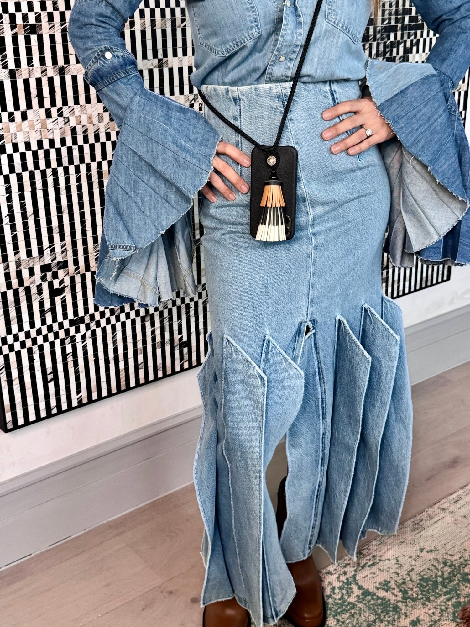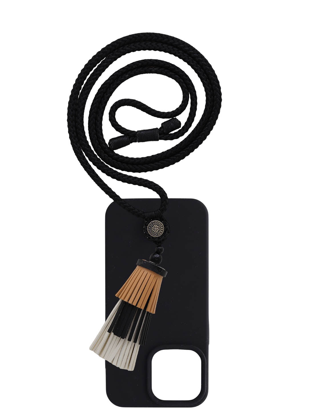 • Tassel: Tan/Black/Off-white vegan leather fringe.